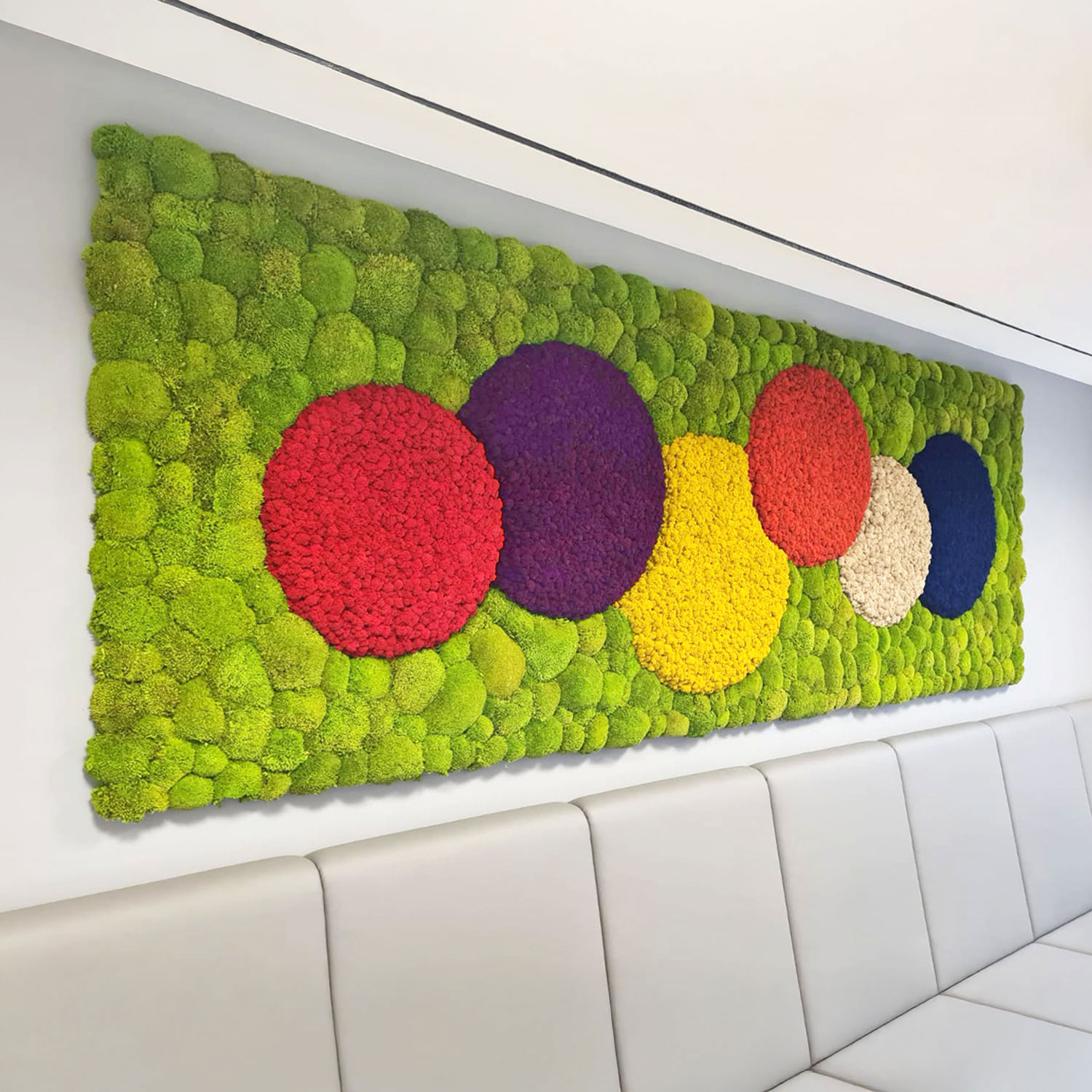Bringen Sie Farbe und Natur in Ihre Räume mit unserem exklusiven Moosbild „Active Circle“. Auf einem satten grünen Hintergrund aus echtem Islandmoos setzen leuchtend farbige Kreise in Rot, Lila, Gelb, Orange, Creme und Blau stilvolle Akzente. Das Kunstwerk vereint natürliche Materialien mit modernem Design und wird so zu einem einzigartigen Blickfang an jeder Wand.