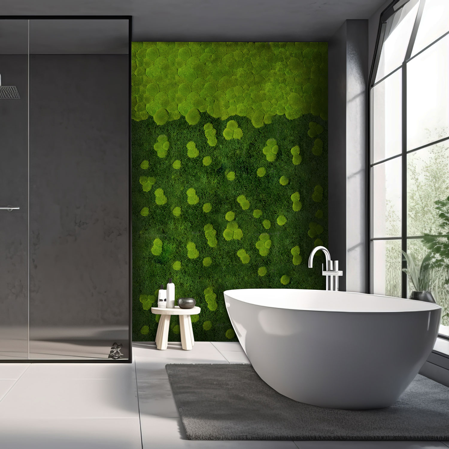 Eine Mooswand mit einem harmonischen Moosverlauf von Ballenmoos zu Waldmoos ist eine einzigartige und ästhetisch ansprechende Möglichkeit, um Innenräume mit einem natürlichen, grünen Akzent zu bereichern. Diese innovative Wandgestaltung verbindet die strukturierten Kugeln des Ballenmooses mit dem weichen, flachen Teppich des Waldmooses um ein dynamisches und beruhigendes Gesamtbild zu schaffen.
